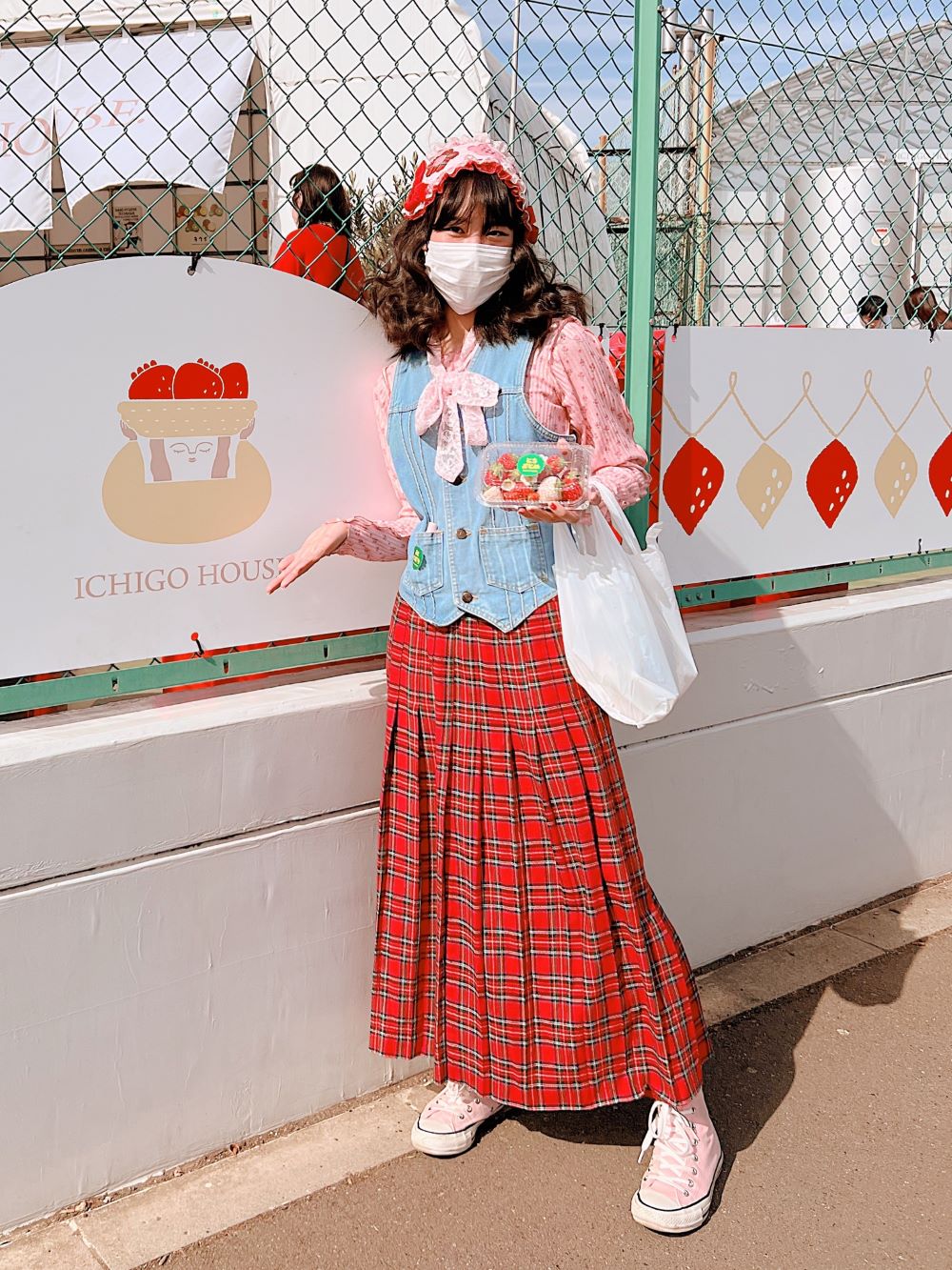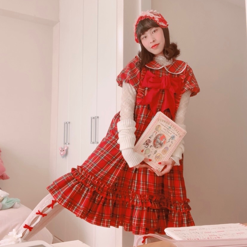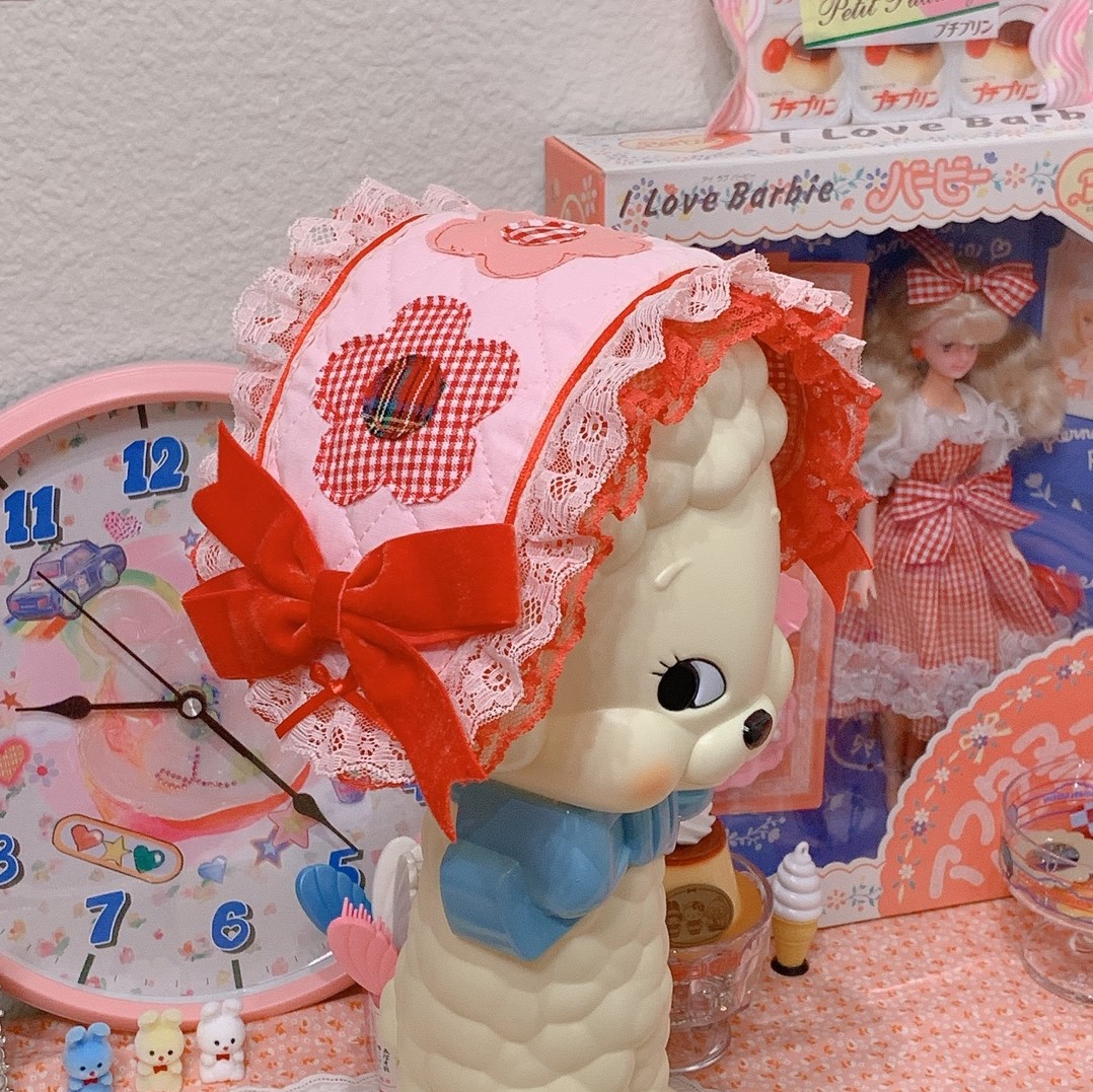 handmade red quilting headdress with red and white lace edge, sewn on flower decals, and velvet ribbon bows. underside is red microcheck fabric.