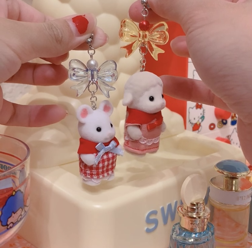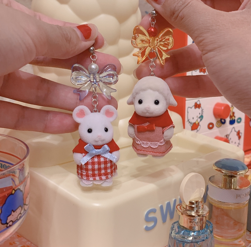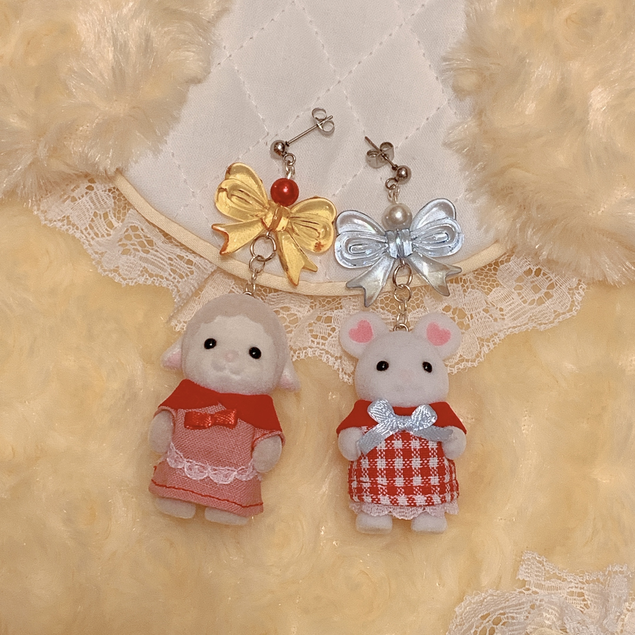 a pair of calico critter earrings, lamb and mouse in handmade playground1997 clothes! decorated with ribbon and faux pearl beads.