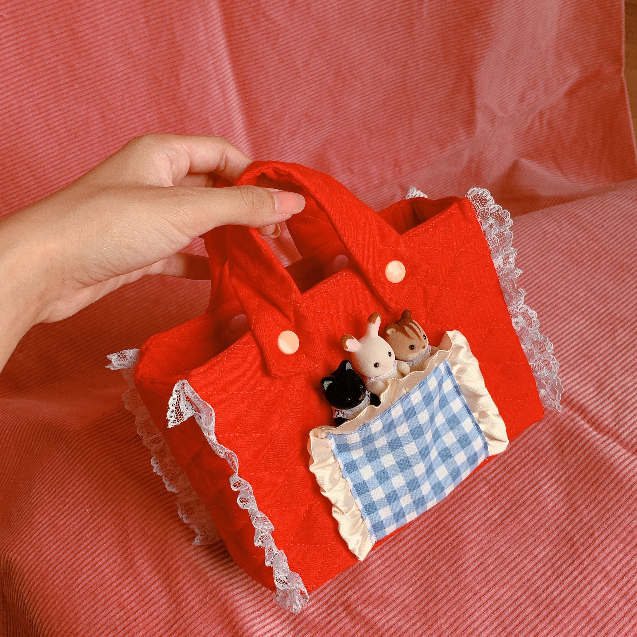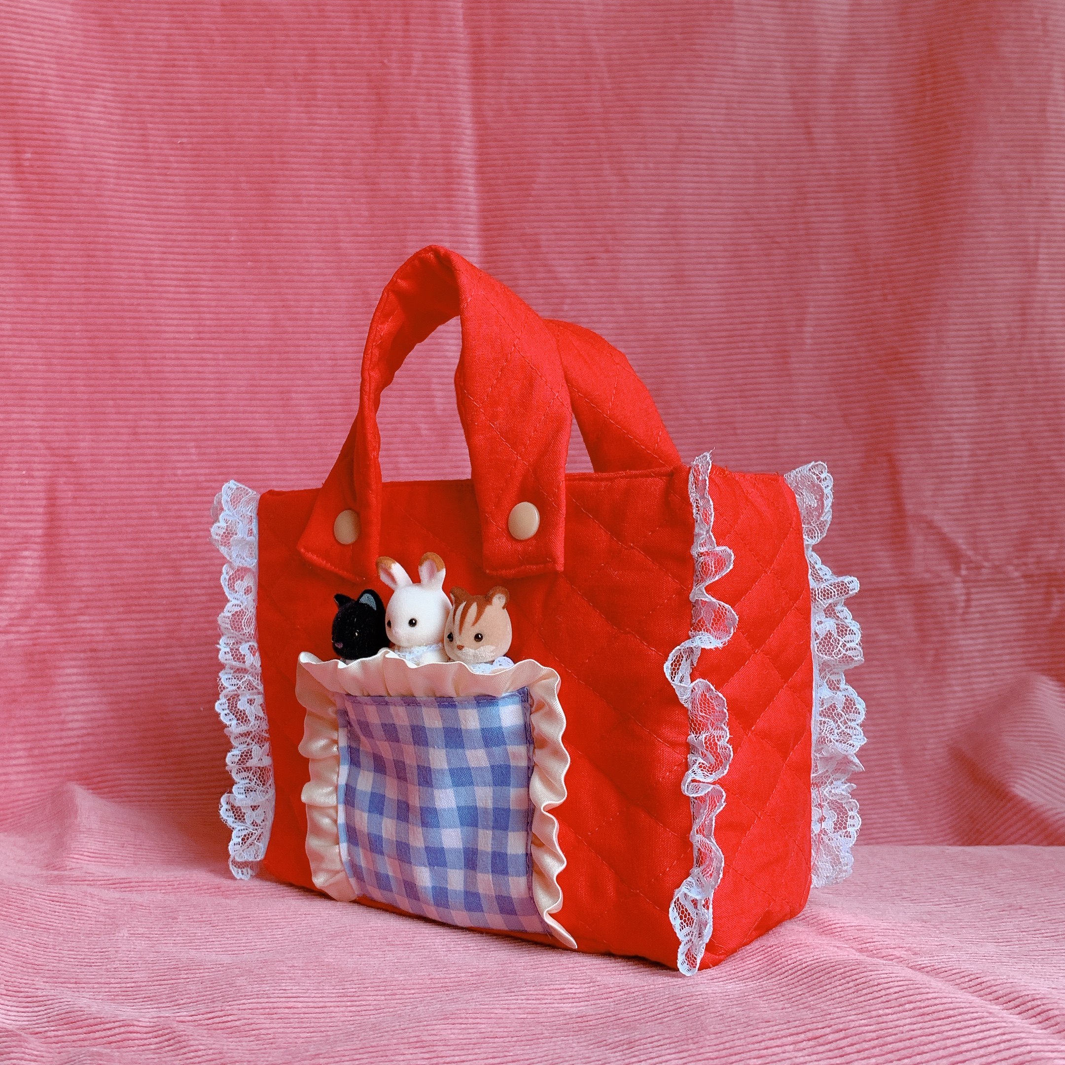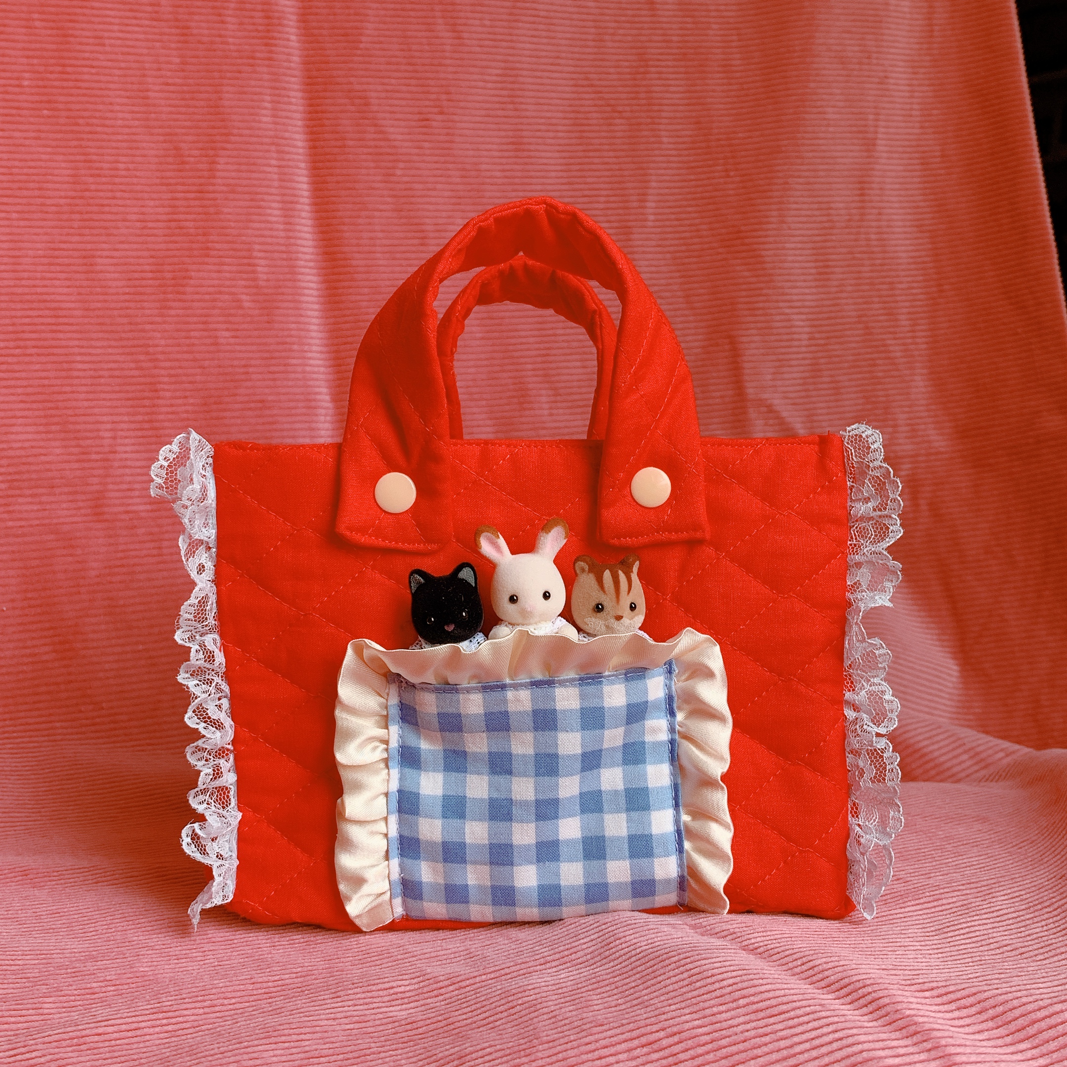 handmade soft handbag. made from red quilted fabric with blanket pocket for small animals to sleep in. detachable/switchable handles.