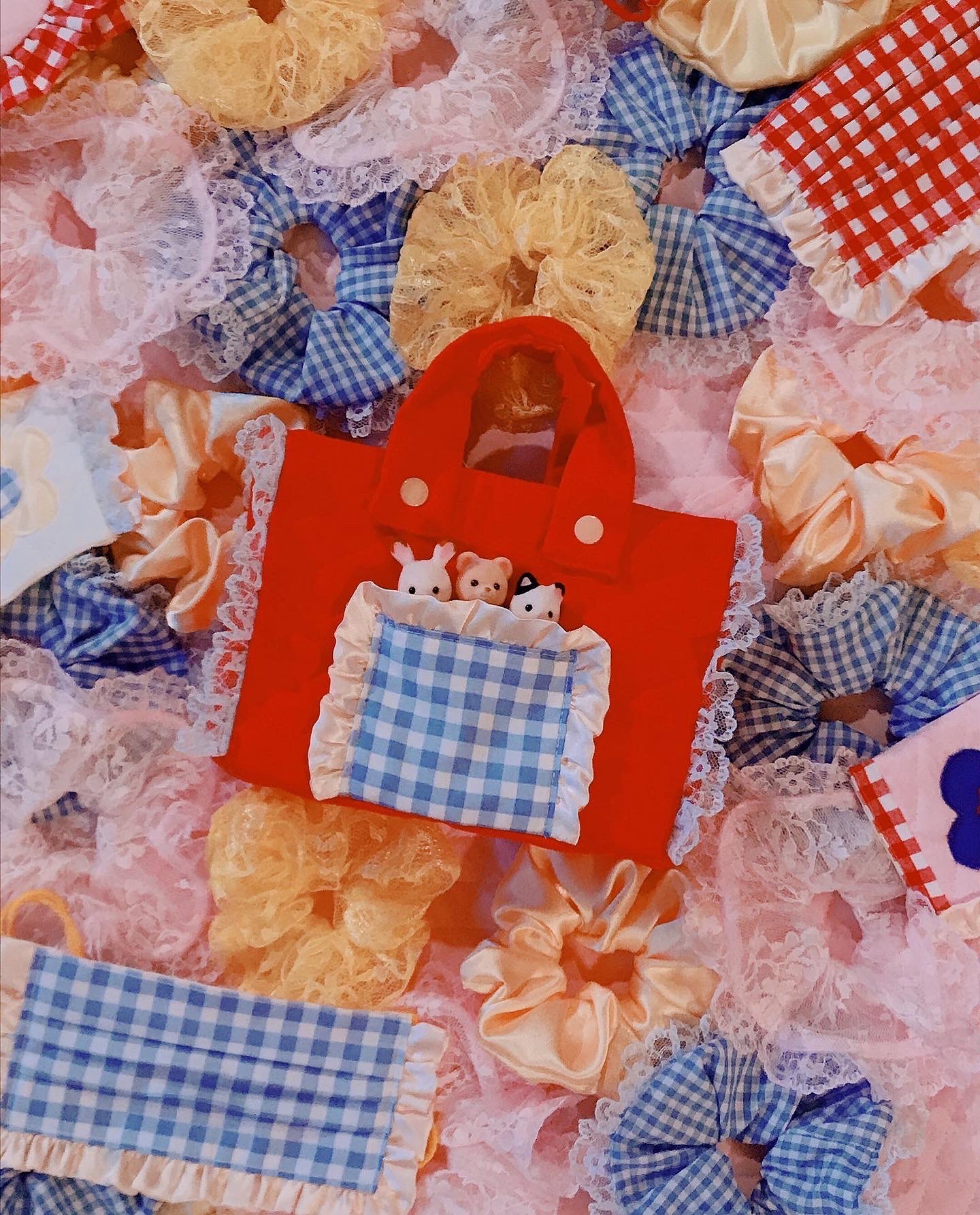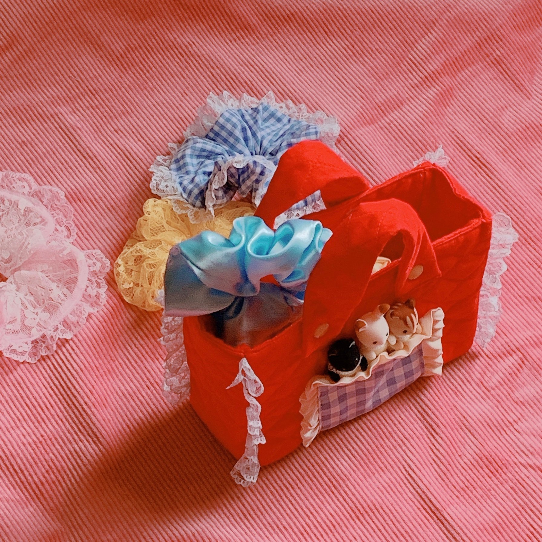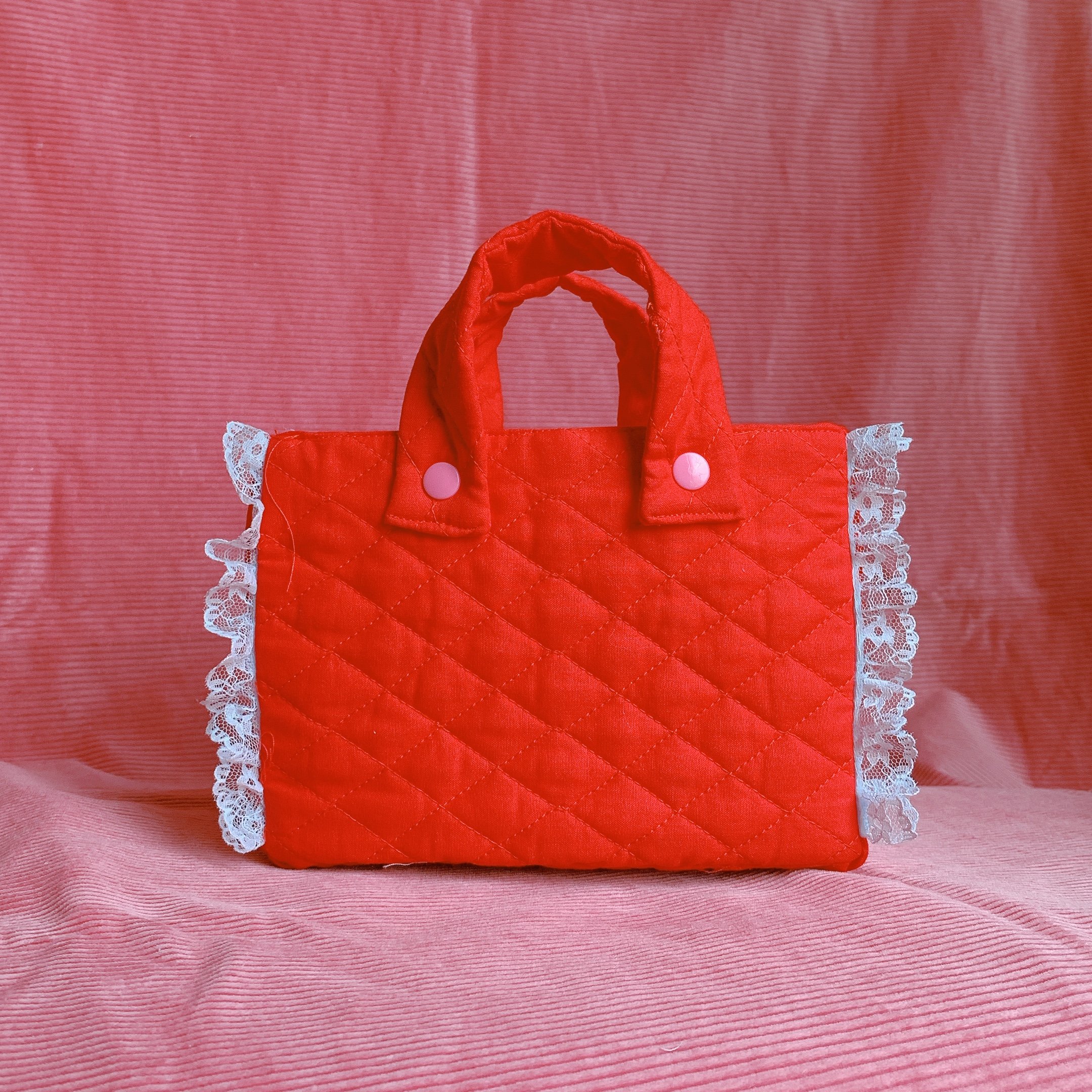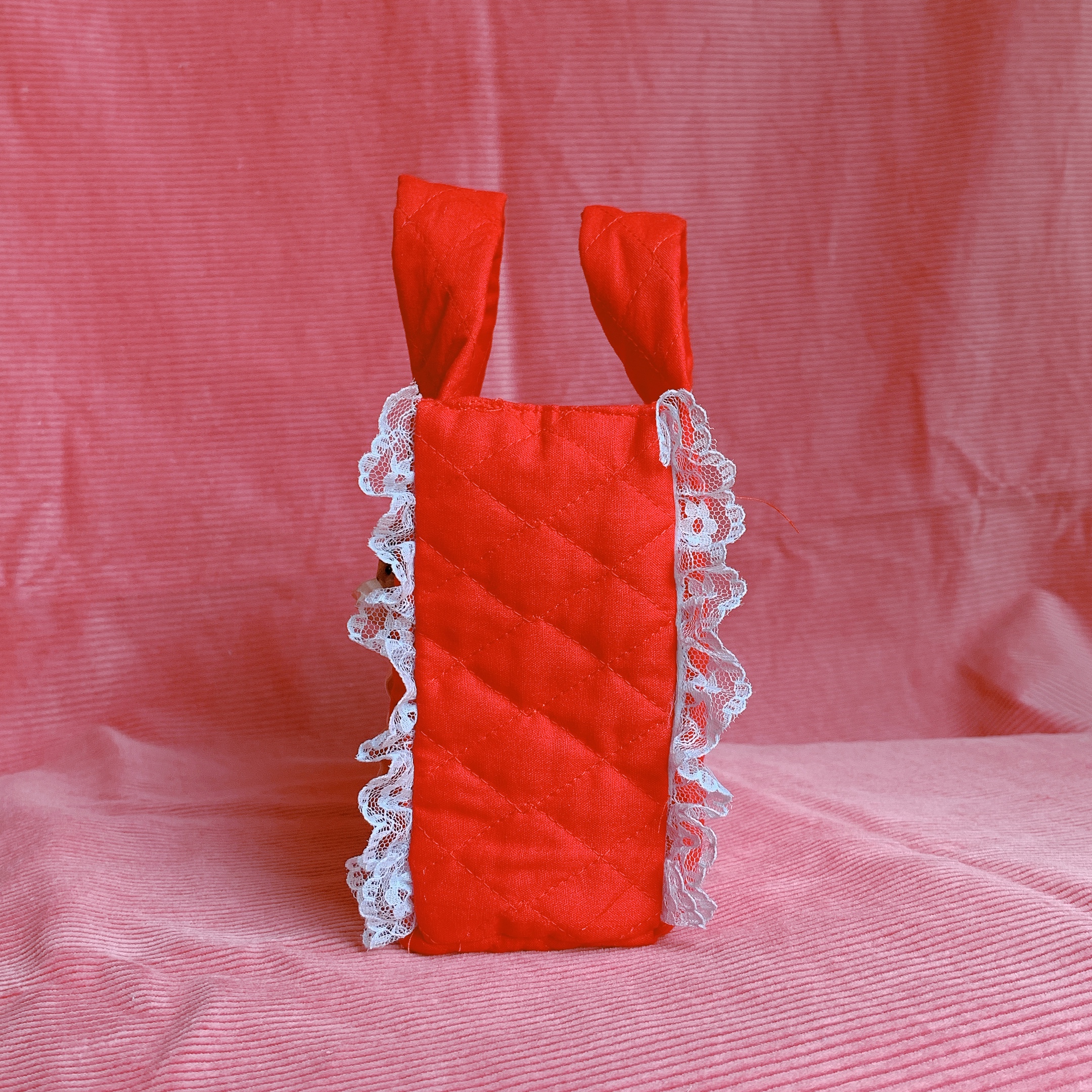 handmade soft handbag. made from red quilted fabric with blanket pocket for small animals to sleep in. detachable/switchable handles.