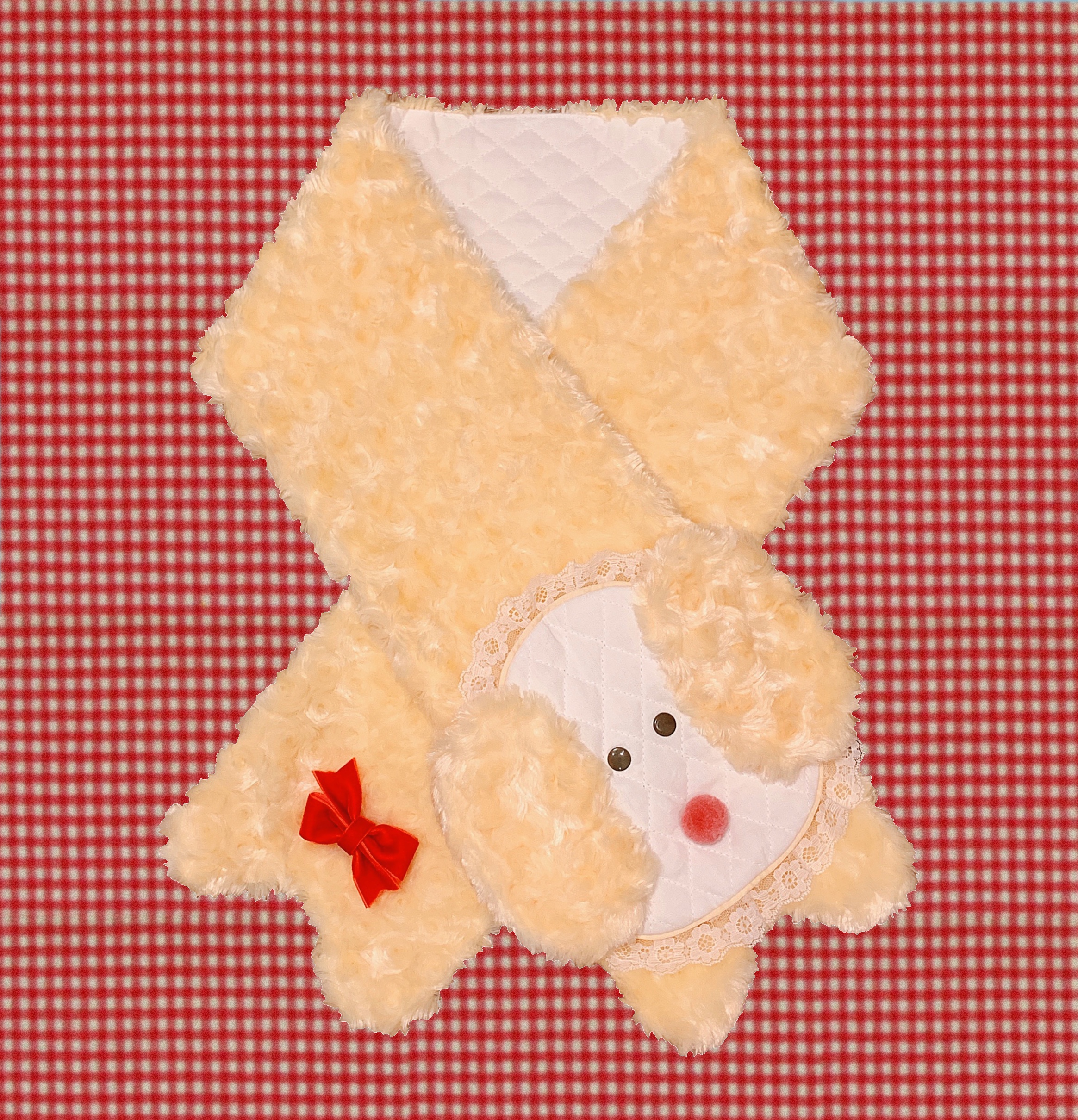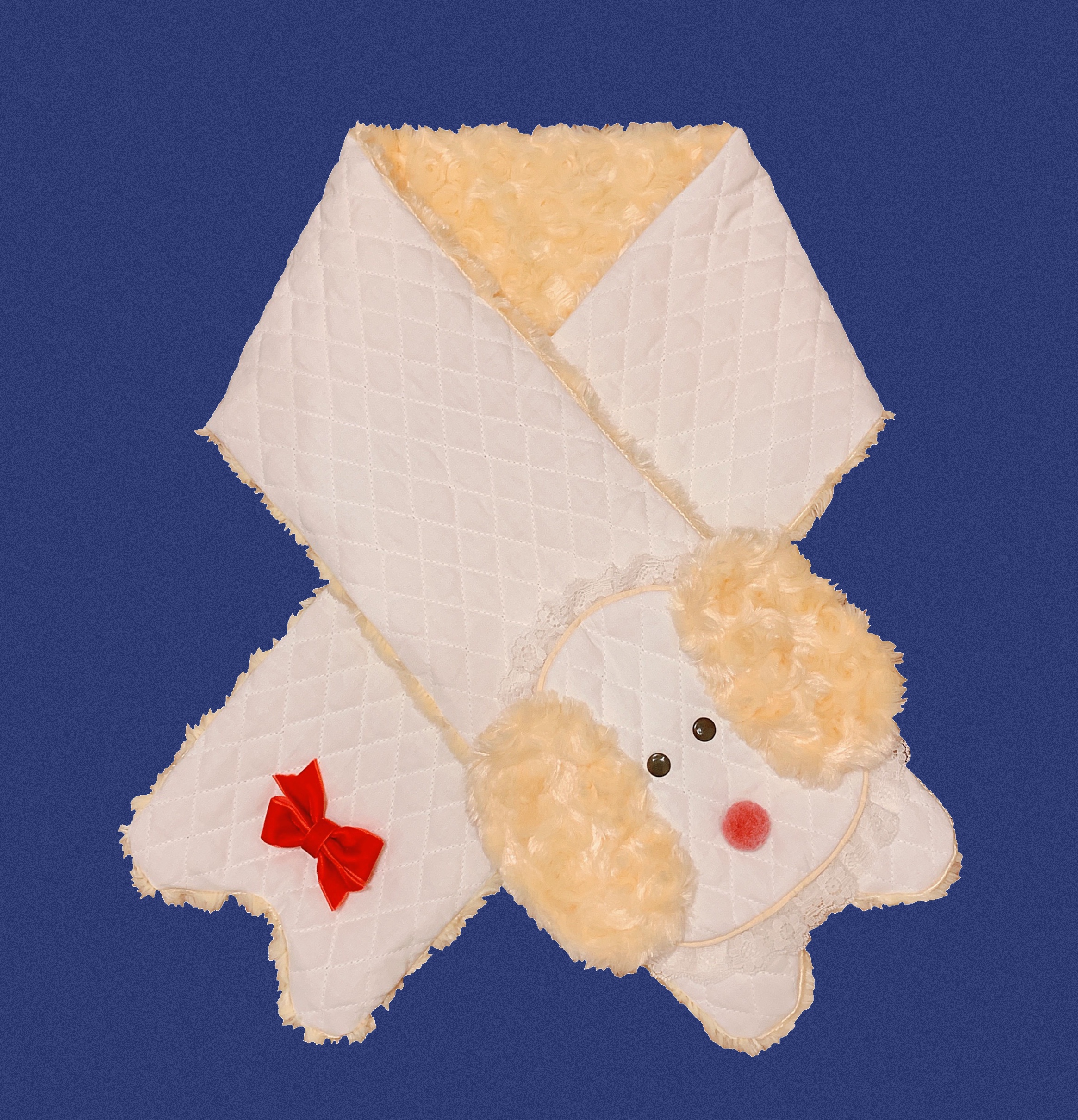 Handmade reversible muffler, white cotton quilting on one side and soft yellow faux fur on the other. Clippord head is detachable (velcro) and can be placed on either side depending on preference. can be styled multiple ways!