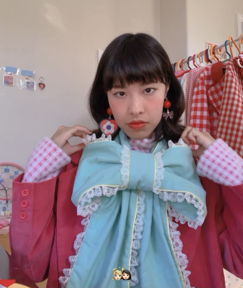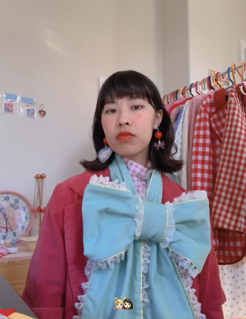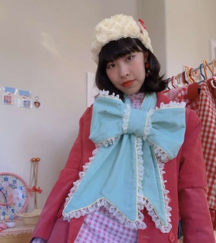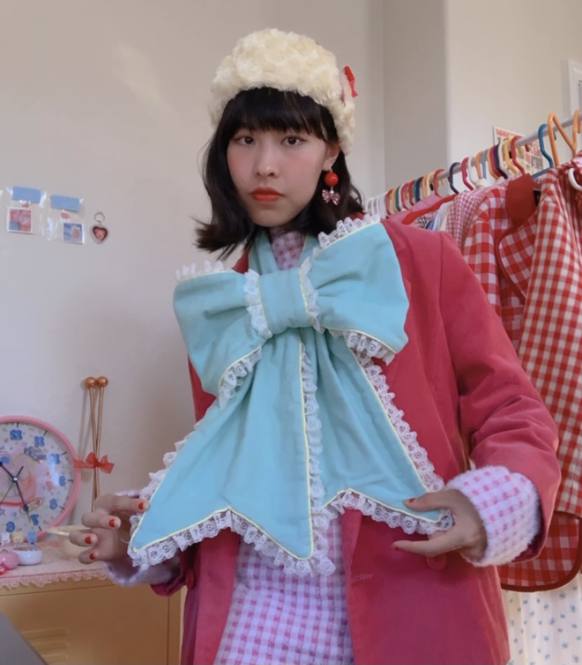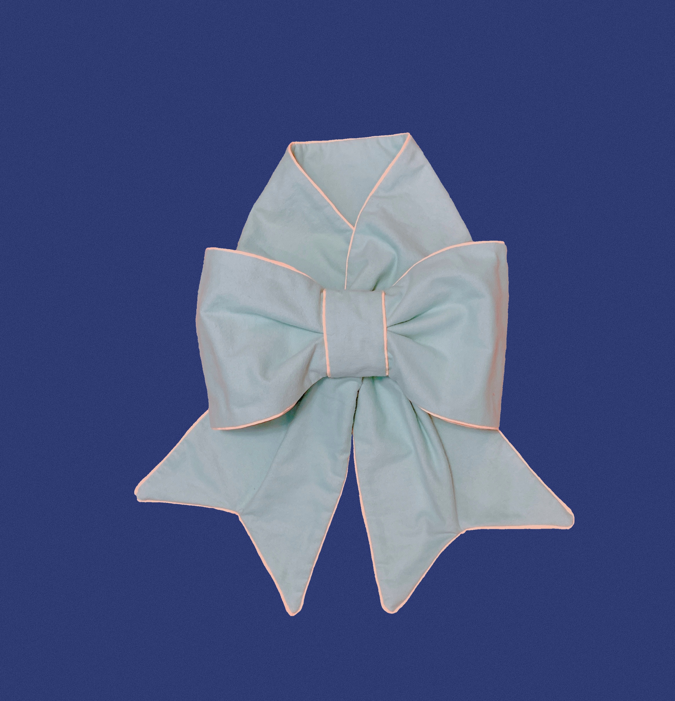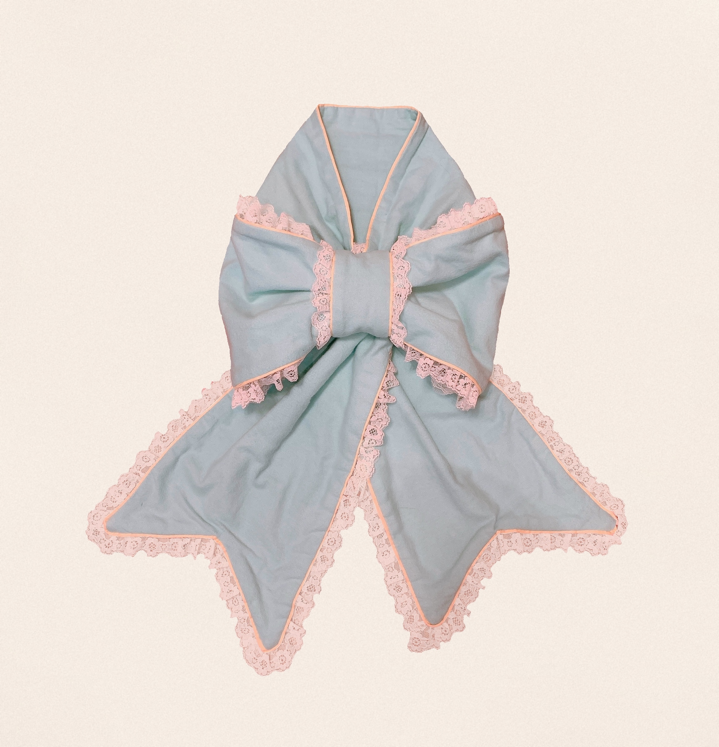 A giant bow as a muffler made from mint fleece, with pale yellow piping and lace edge detailing. Become a present!